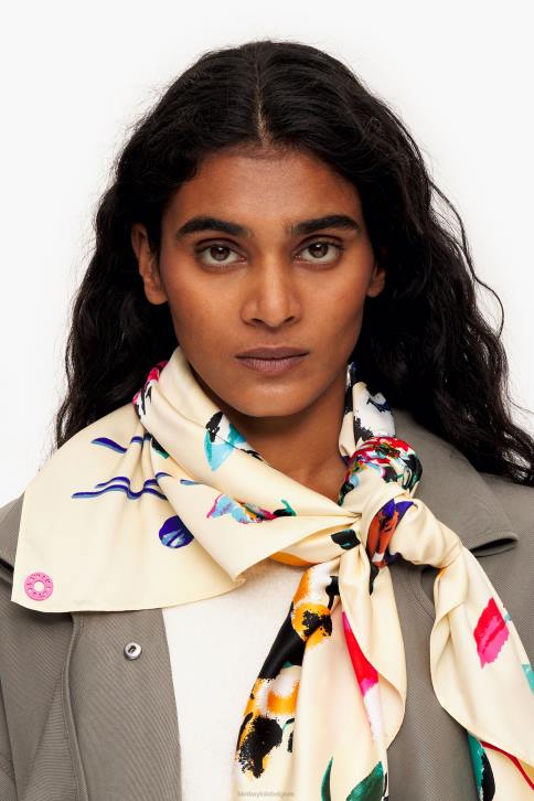 vierkante sjaal met bloemenprint en contrasterende xl-contouren op een crèmekleurige achtergrond. dit model bevat 100% gerecycled polyester.